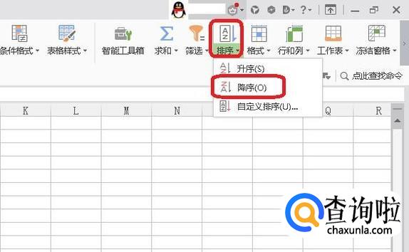 此时,我们点击菜单栏“开始”下面功能区中的“排序”,选择“降序”(选择升序也可以)。