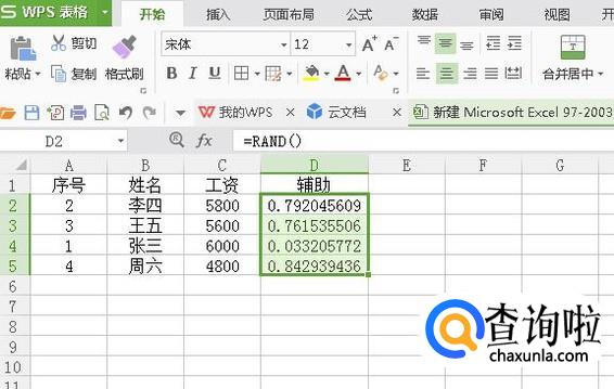 D2单元格出现一个随机数值(介于0~1之间),如图所示,然后我们向下填充格式,造一个辅助列。