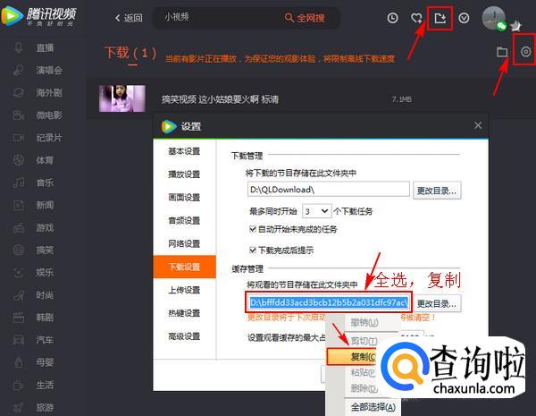 在腾讯视频缓存好视频之后,进入下载设置界面,找到视频的缓存位置,把此位置右键复制下来。