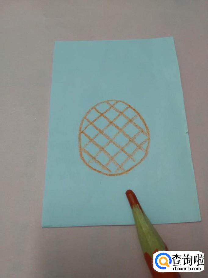再用笔画一些向左的斜线,所有斜线把椭圆形分成许多菱形的小块,表示菠萝上的纹路。