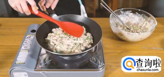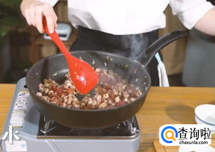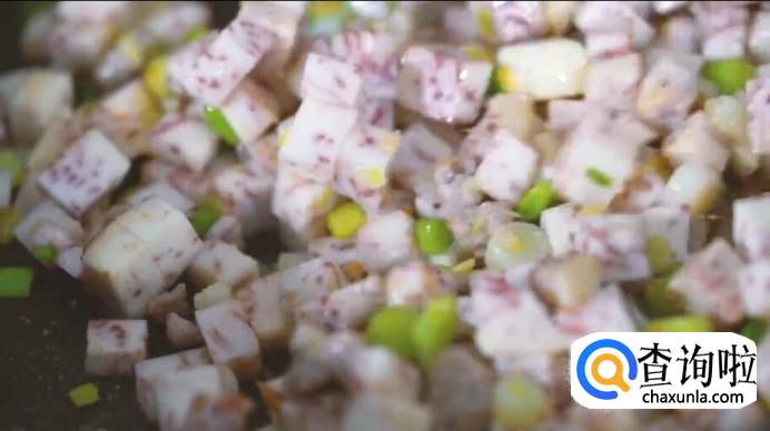 然后放入肉馅翻炒均匀后放入芋头丁。