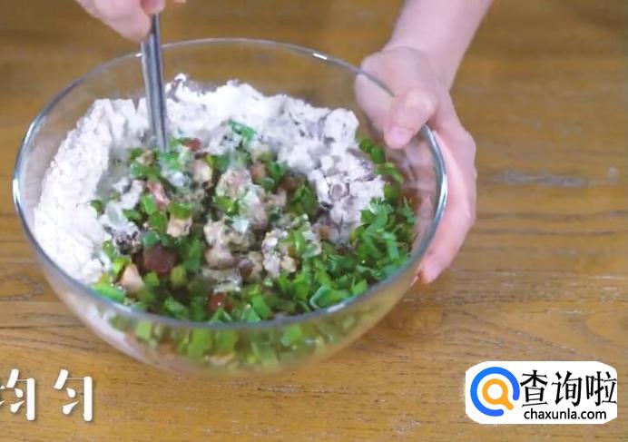 刚刚炒好的芋头丁等食材中,加入蒜苗、面粉、香油、芝麻、鸡蛋、饮用水,搅拌均匀。