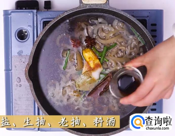 接着,放入盐、生抽、老抽和料酒。