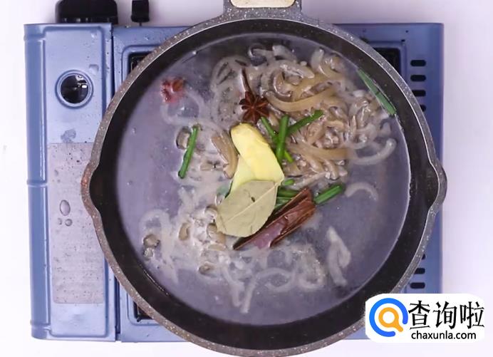 水煮沸后,倒入猪皮丝,放入葱段、姜片、桂皮、八角。
