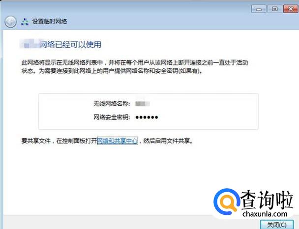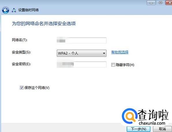 在这里把要共享的网络名和密码输上,点选“保存这个网络”,再点“下一步”。