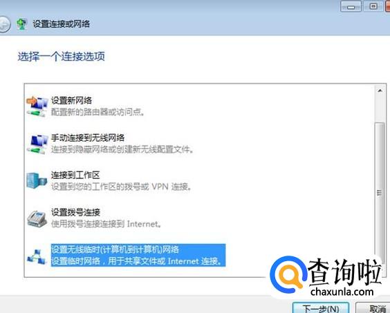 然后在“选择一个连接选项”下把下拉条拉到最后,点击“设置无线临时(计算机到计算机)网络”。