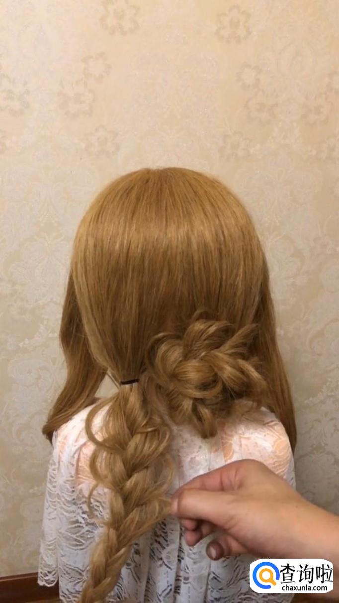 将右侧扎好的头发分成三份,辫成三股辫,编好后,用手轻轻扯出少许,使效果更自然。