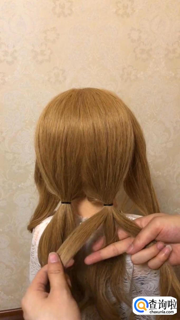 头发梳顺后,将头发分成粗细均等的四份,将中间的两份在发根处扎紧。