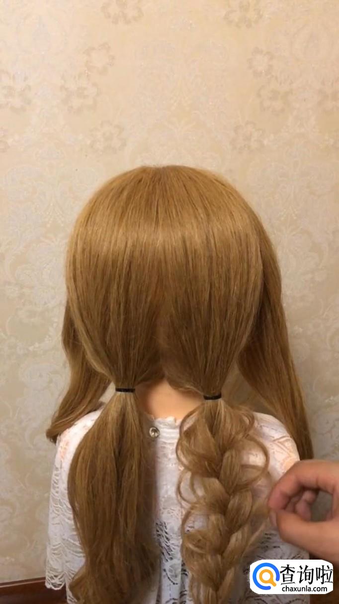 再将左侧扎好的辫子也变成三股辫后,盘好固定。