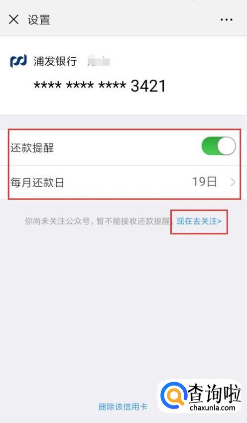 打开还款提醒,设置好还款日的时间,根据页面提醒,我们还要关注公众号才能接收还款提醒。