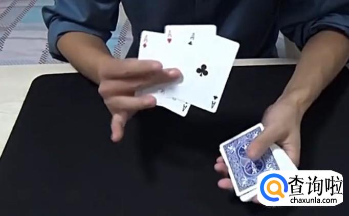 拿起观众抽的牌背面朝上,叠放在A的上面,另一只手将抽出来的牌和四张A一起拿着,接着在一张一张看牌时,分别把抽出来的前3张牌放在A下面去