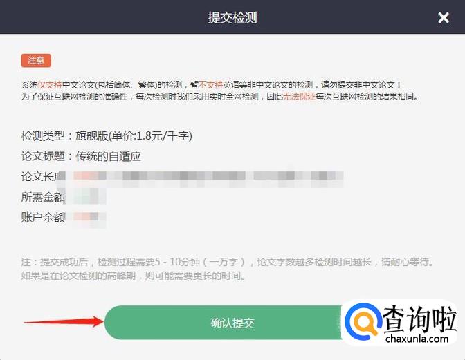提交检测后,会进入付款界面,用之前充值码获得的金额进行付款,点击“确认提交”,提交后,会提示提交成功