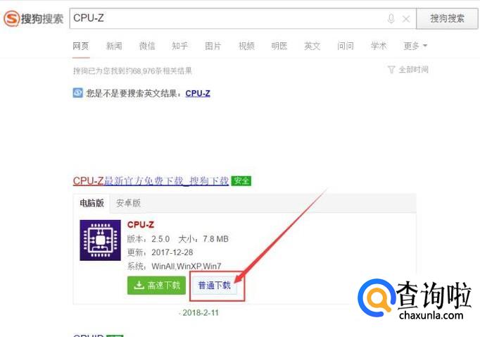 一般情况下,如果要检测内存条电压版本,要使用CPU-Z版本,所以,我们要搜狗搜索“CPU-Z”,并下载该软件。