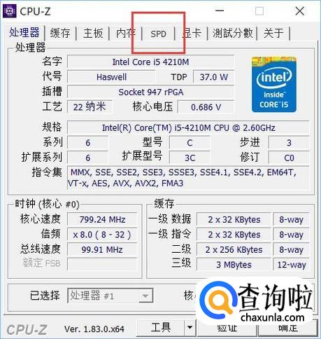 打开CPU-Z软件主界面之后,点击页面中的“SPD”选项,即可查看到内存条的类型、频率和电压。
