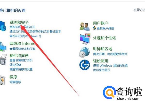 打开电脑的控制面板,进入之后点击“系统和安全”,进入下一页面,如图所示。
