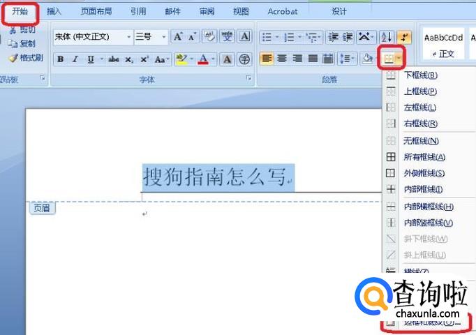 点击“开始”,点击工具栏中图中所示的“下框线”按钮,弹出下拉菜单,选择“边框和底纹”。