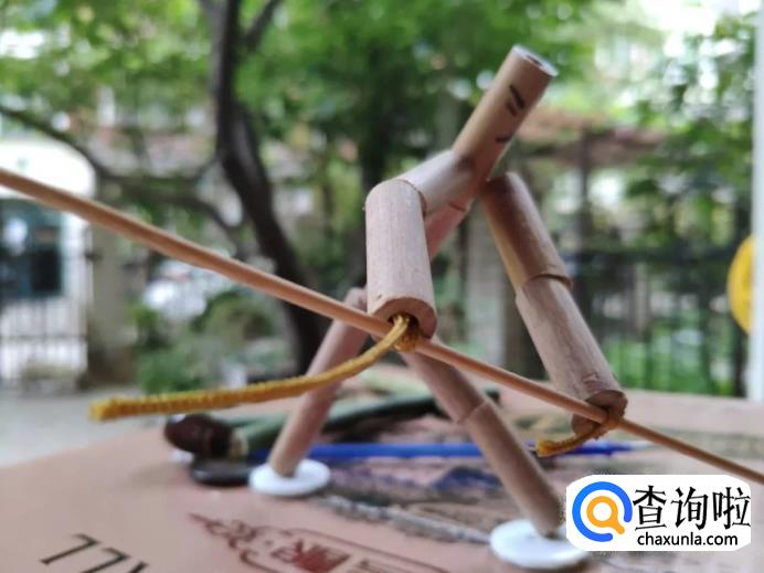 把竹节人下面的鞋线嵌入课桌裂缝里,在下面一拉紧,这样竹节人就站立起来了。