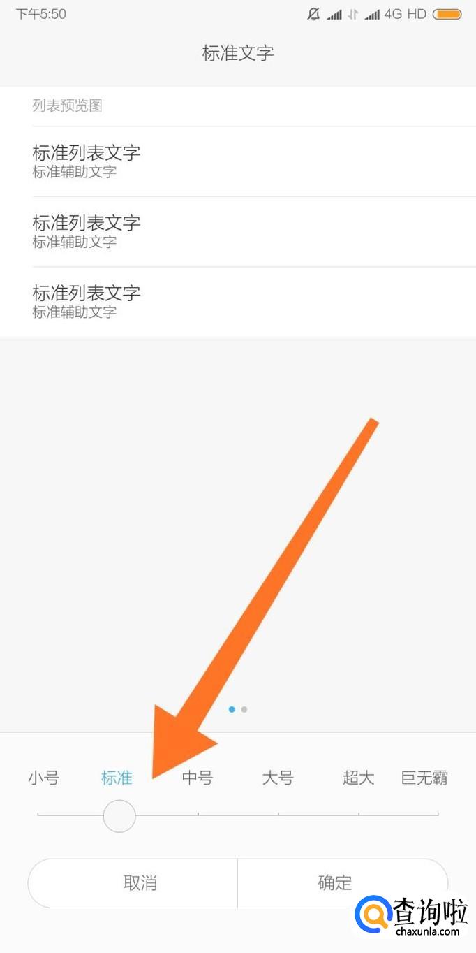 点击进入“字体大小”设置选项后,拖动圆形的图标就可以调节手机字体的大小,屏幕上方还会有字体预览效果。