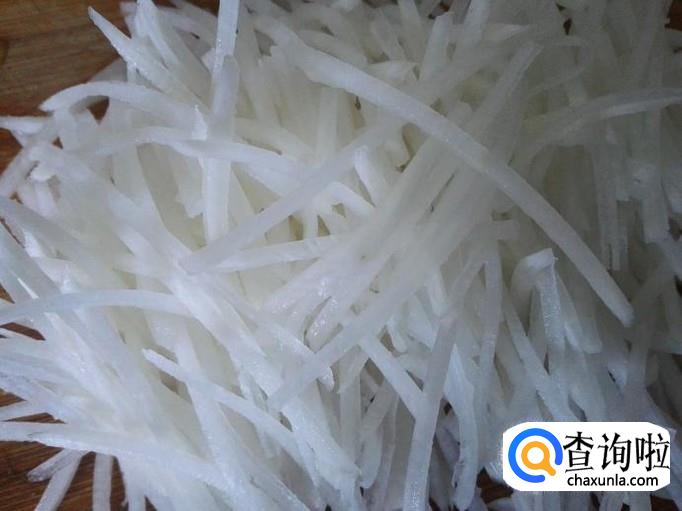 然后把准备好的萝卜切成丝,并切成末,备用。