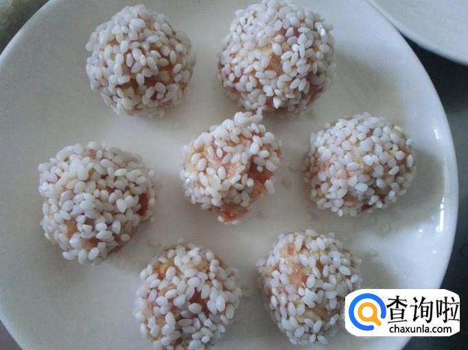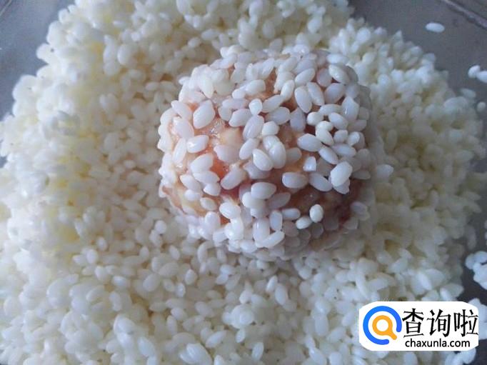 接着我们可以把搅拌好的肉馅做成一个团子,然后裹上备好的糯米。