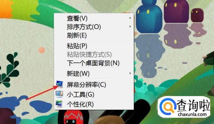 右键点击桌面上的空白地方,在右键菜单上点击‘屏幕分辨率’