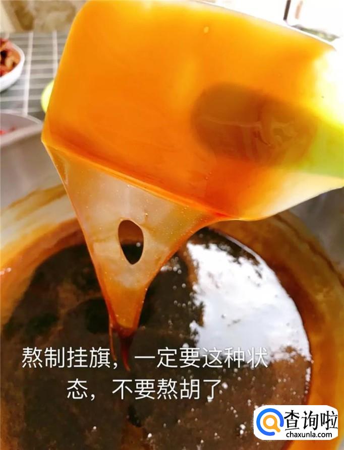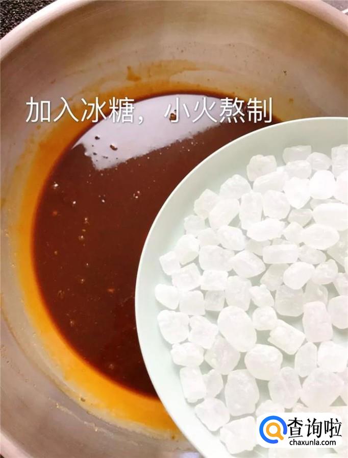然后加入冰糖小火熬制,如下图所示。小贴士:大家在熬糖的过程当中,一定要用铲子不停地搅拌,避免粘锅。