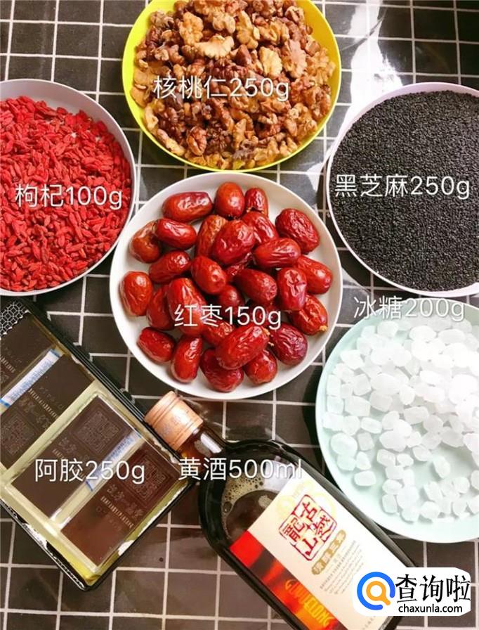 首先准备好所有要用到的食材,如下图所示。小贴士:核桃仁250克,枸杞100克,红枣150克。阿胶250克,黄酒500ml。冰糖200克,黑芝麻250克。