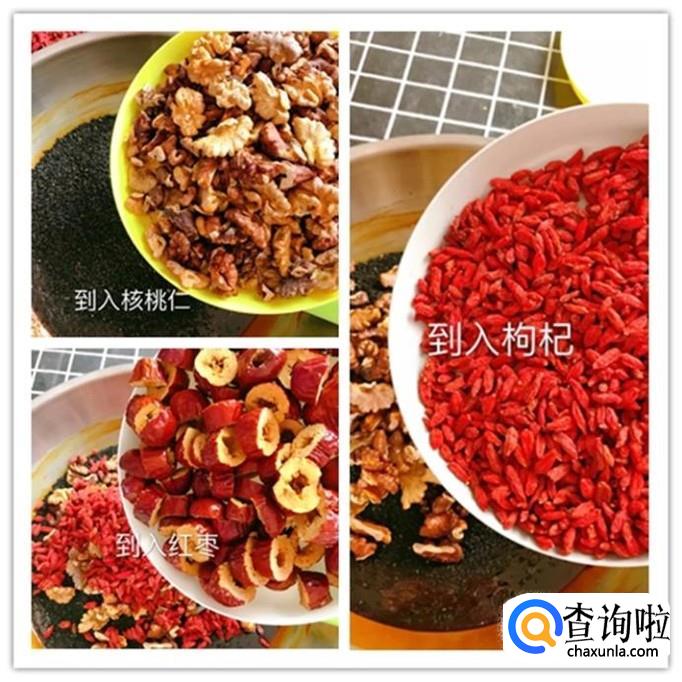 接着分别加入核桃仁红枣和枸杞,翻拌均匀,如下图所示。
