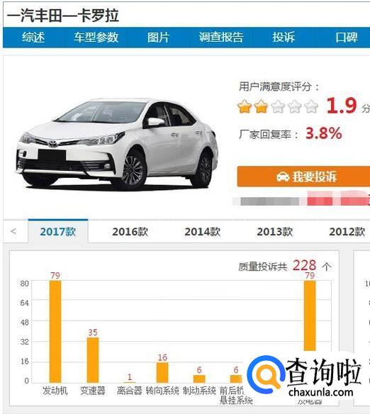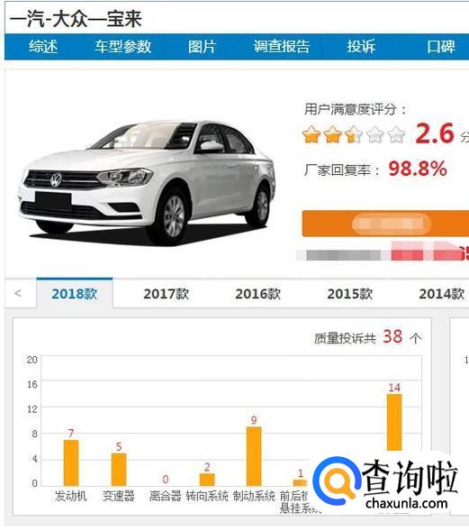 故障对比,我们可以通过车质网用户投诉的情况来参考宝来与卡罗拉在车子质量方面做对比,由数据进行甄选。通过以上分析,大家可以根据个人的接受程度进行选择了。