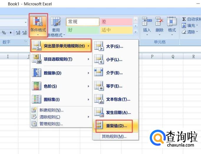 然后我们点击工具栏中的条件格式,弹出的界面,我们点击突出显示单元格中的规则,弹出的界面,我们点击重复值;