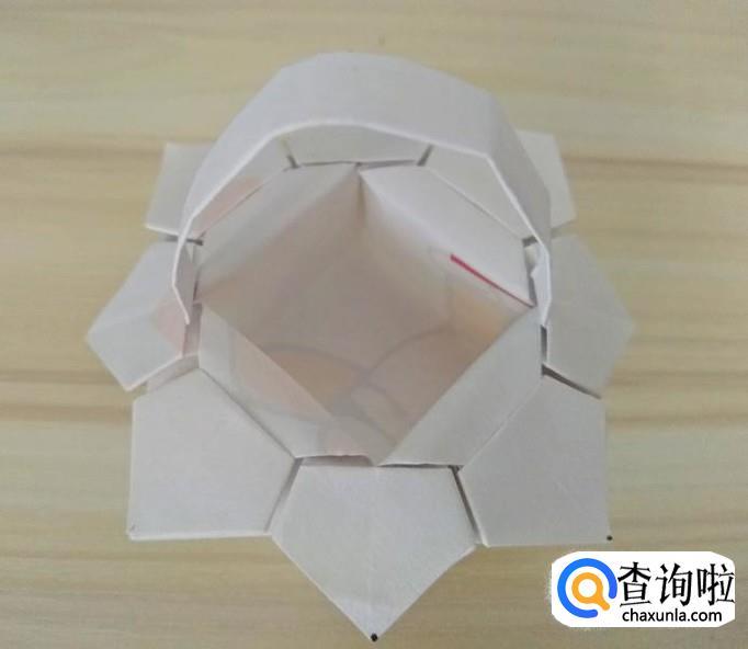 最后折一个长条,将长条两端塞到相对的两个花瓣里,八角花篮就做好了;