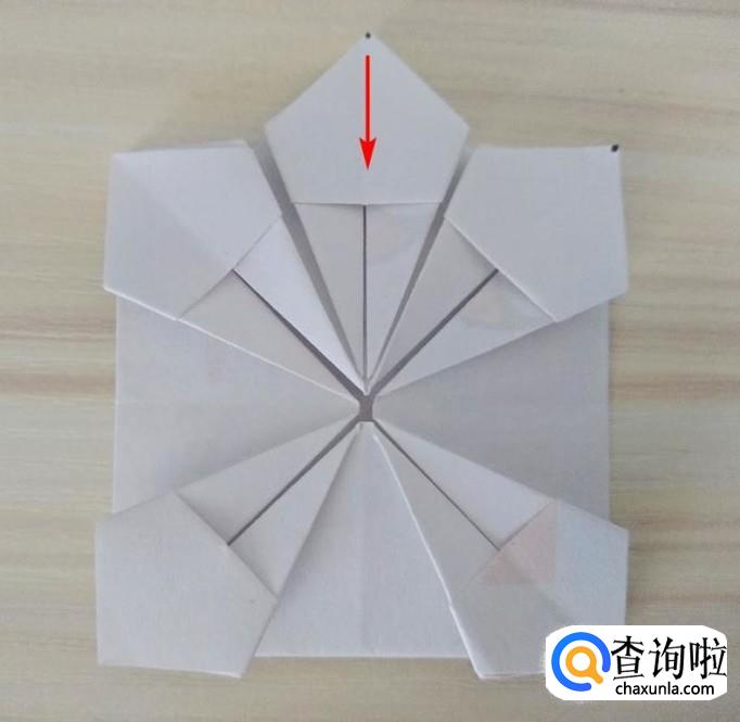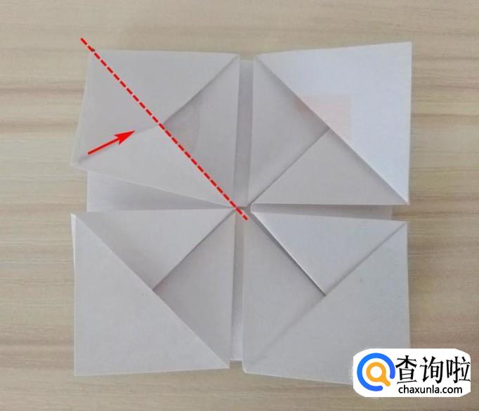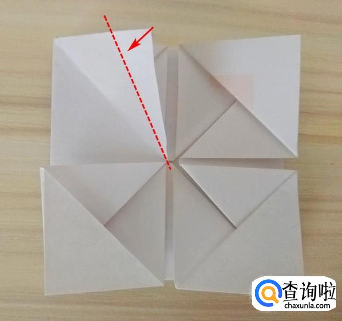 捏着中间的角沿着虚线向上折,尖角插到上面的缝隙中,剩下的三块做同样的操作,折好以后整体呈规整的八角花;
