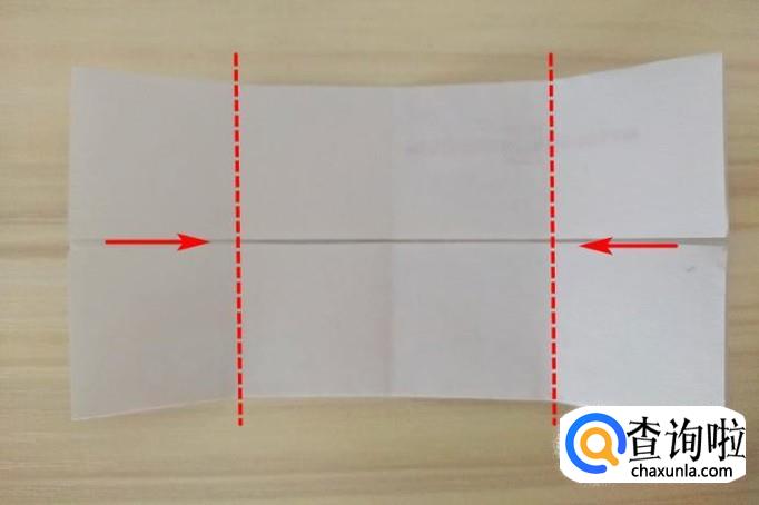 再将“长条”对折一个折痕,左右两个边沿着虚线向中间折痕对齐折叠;