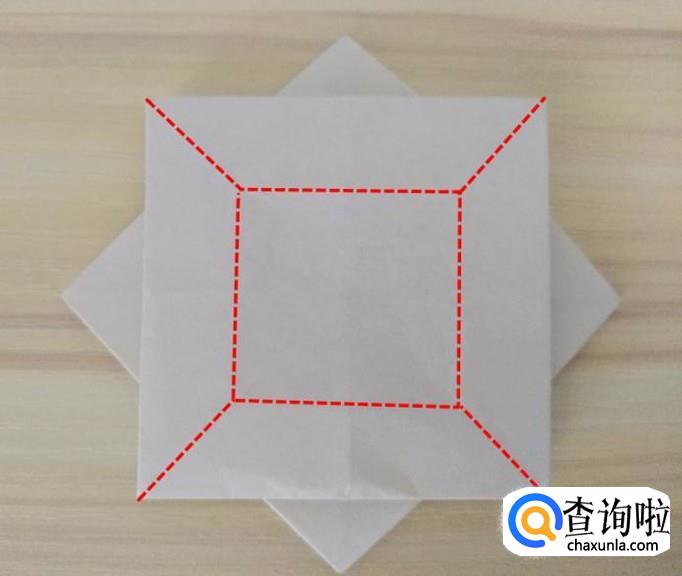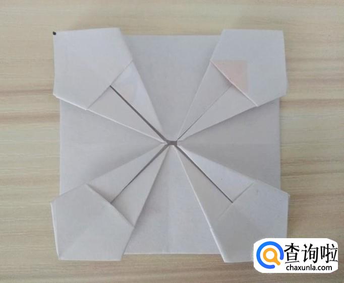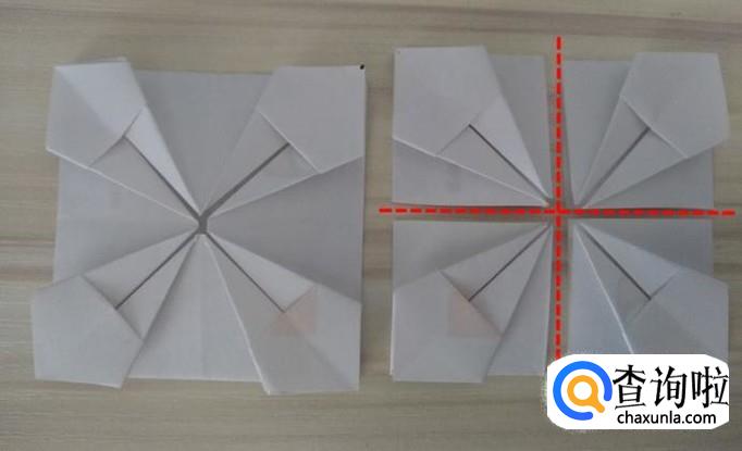 分别拉着中间的四个角沿着自己的对角线向外翻折,外形不变;
