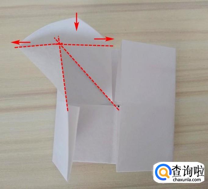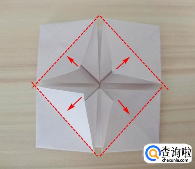 先拉出一个角,如图沿着虚线,左右两个角向外拉,中间的角向下压,其他三个角同样折法,整体外形无变化;