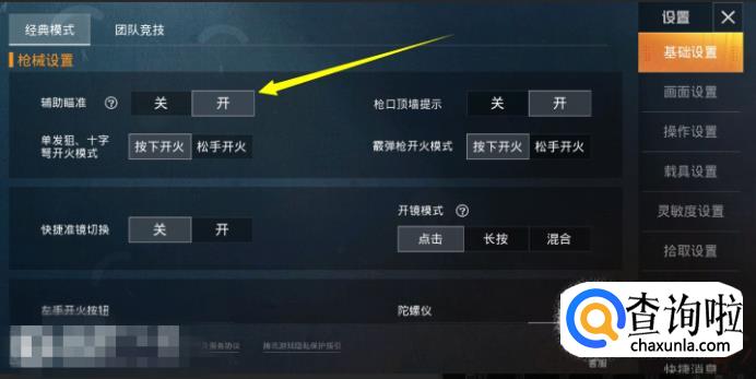 在基础设置中我们就可以看到辅助瞄准的开关,点击打开。
