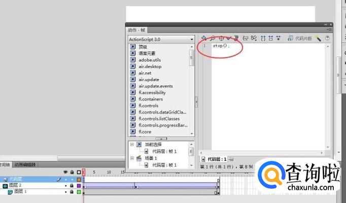新建图层3,更名为代码层,然后点击F9,在弹出的窗口中输入代码stop();,如下图所示: