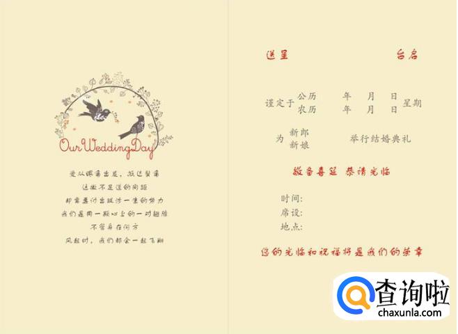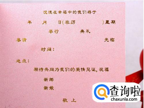 接着写上结婚的日期,加上结婚两人的名字上去,这种写法是以新人自已身份宴请亲友,还有一种是以新郎父母身份宴请亲友。