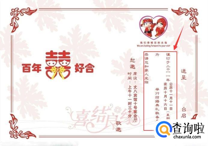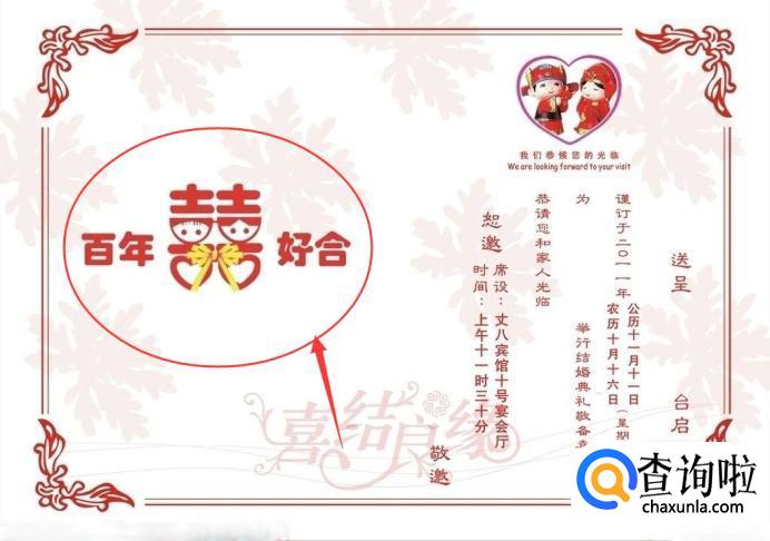 首先是在请柬中直接表明这次请柬的内容是什么,一般结婚使用的是【喜结良缘】或者【百年好合】。