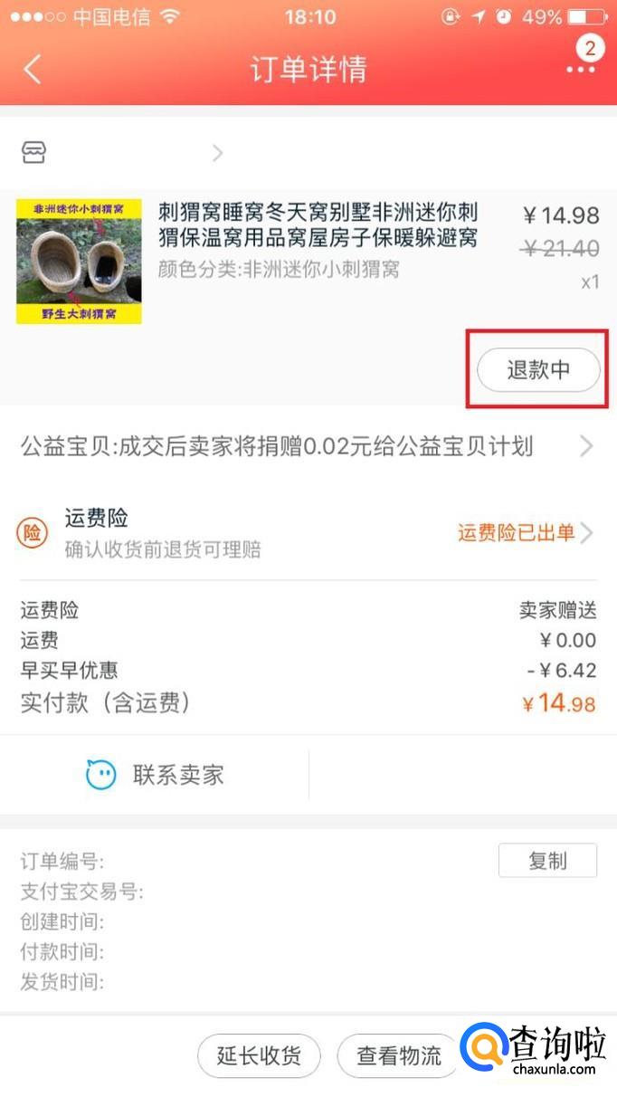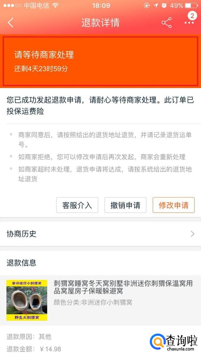 卖家同意后,将商品寄回卖家给的地址,等待卖家收货,这时商品页面显示“退款中”。
