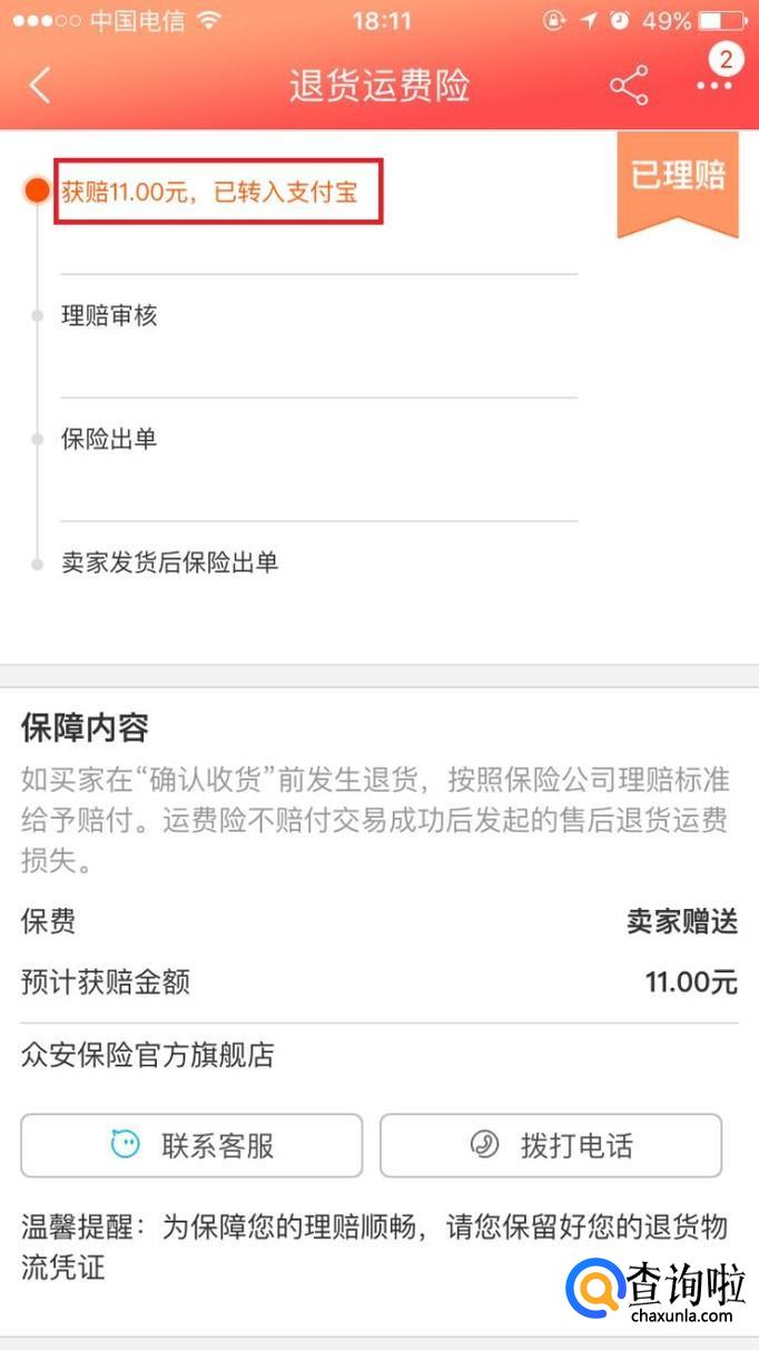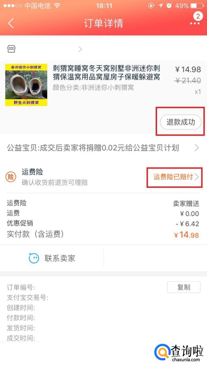 卖家收到商品确认无误后同意退款,我们再进入商品详情页面,上面显示“退款成功”,点击“运费险已赔付”。