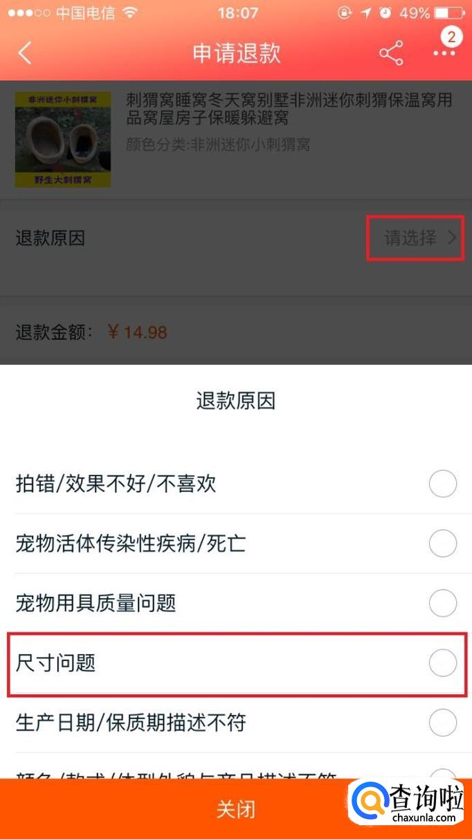 在退款原因右边点击“选择”,选择一个退款的原因。