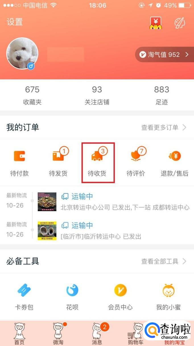 在个人中心页面点击“待收货”。
