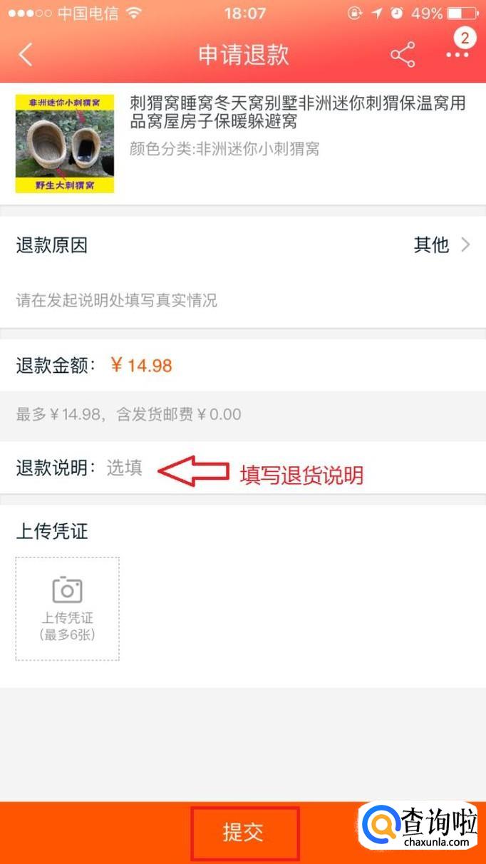 填写退货的详细说明,然后点击下方的“提交”。