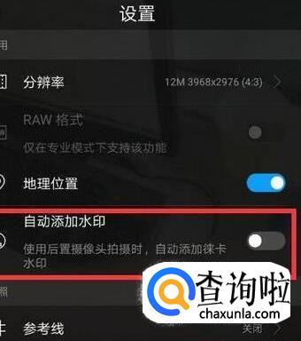 进入设置菜单后,找到并点击打开【自动添加水印】的开关即可在拍照时添加水印,关闭开关即可去掉水印。