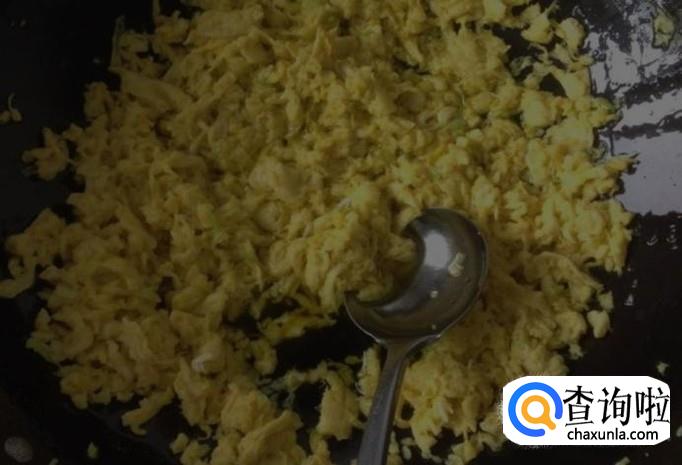 在锅中加入油适量,等待油八分热时,加入鸡蛋,鸡蛋入锅就开始翻炒,将其煎成碎鸡蛋,如下图所示