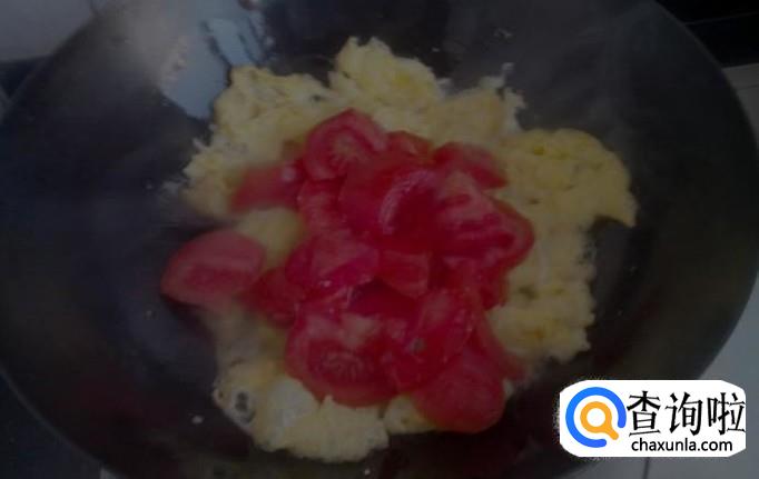 然后我们倒入番茄片,翻炒均匀,30秒之后加入水适量,慢火将水煮开