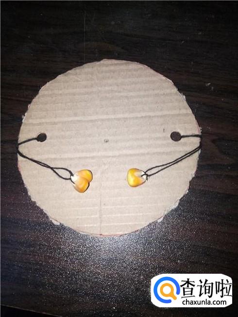 利用针线穿两颗玉米粒,然后把末端系紧在打好的小孔上。