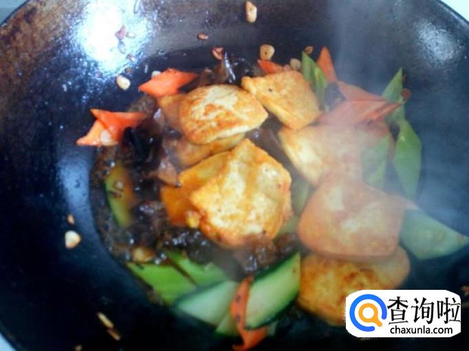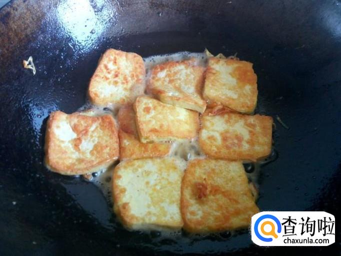把煎好的豆腐放入锅中,倒入调制好的料汁,略翻炒一下,料汁粘稠后,关火出勺。