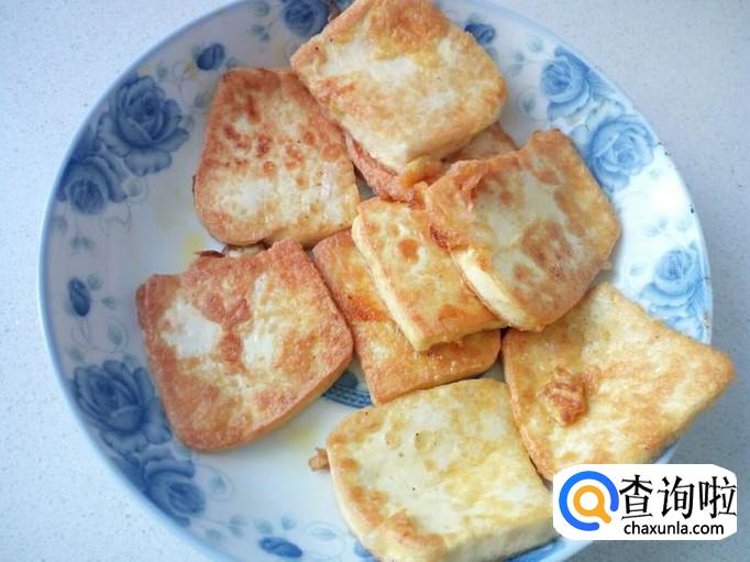 锅内放油加热,油热后放入豆腐小火煎塌,煎塌至两面焦黄,盛入盘中备用。